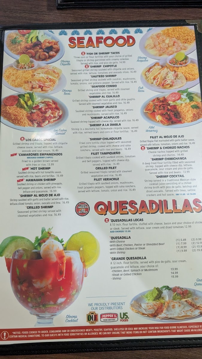 Grilled chicken steak or shrimp saut?ed with onions tomatoes and your choice of jalape?o poblano or bell pepper topped with ranchero chipotle or tomatillo sauce garnished with cambray onions cactus leaf and slice of chihuahua cheese. served with whole beans and tortillas. pineapple upon request.